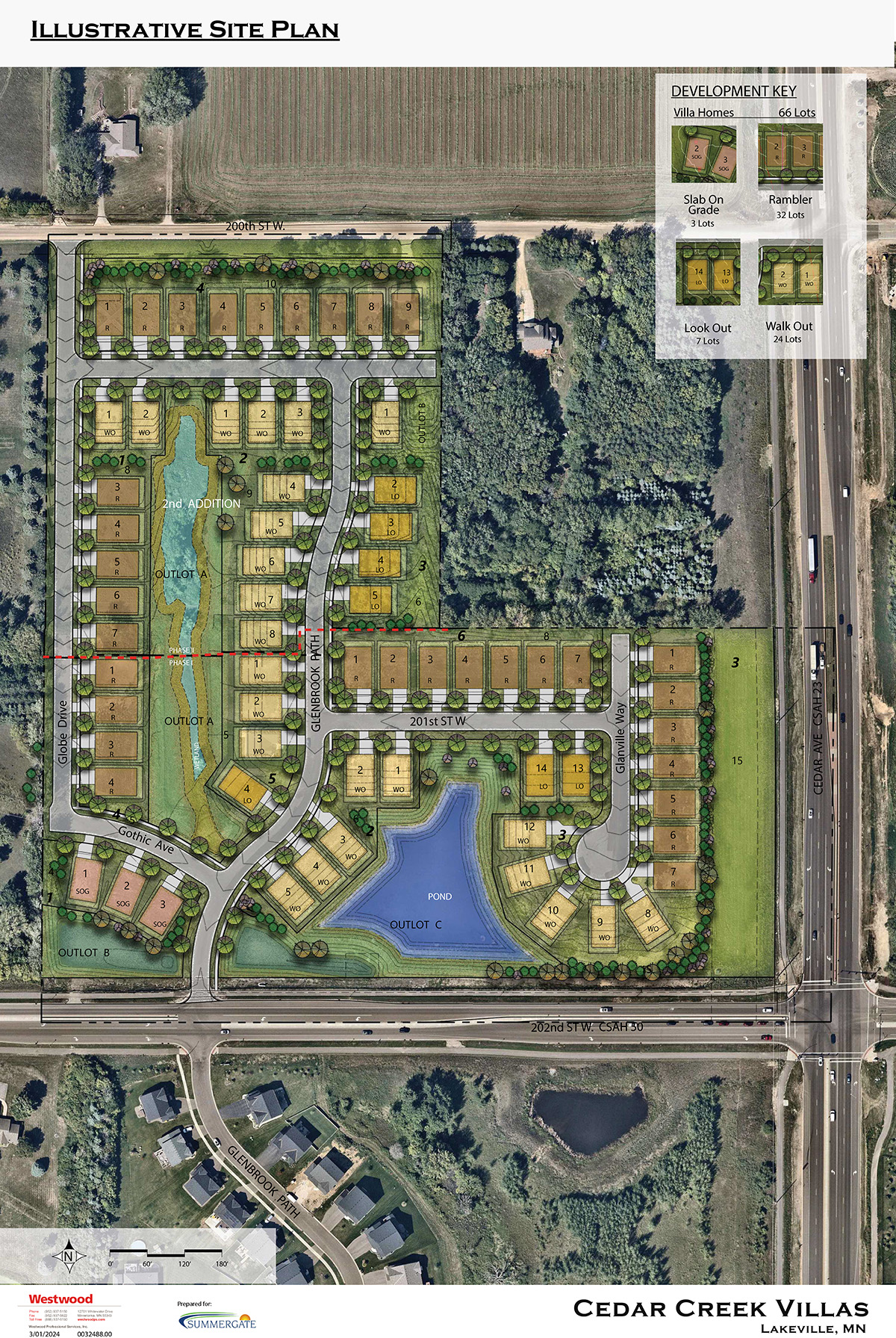 Cedar Creek Villas, within the City of Lakeville, consists of 37 single-family villa lots conveniently located at the southwest corner of Cedar Avenue and Highway 50 (202nd Street). The site is situated within close proximity to shopping and employment opportunities as well as plenty of outdoor recreational destinations. The lots are sized to accommodate a 40’ by 70’ pad and many back up to water features. Cedar Creek Villas is an association-maintained community, handling everything from lawn and snow to garbage and recycling pickup- carefree living at its best.