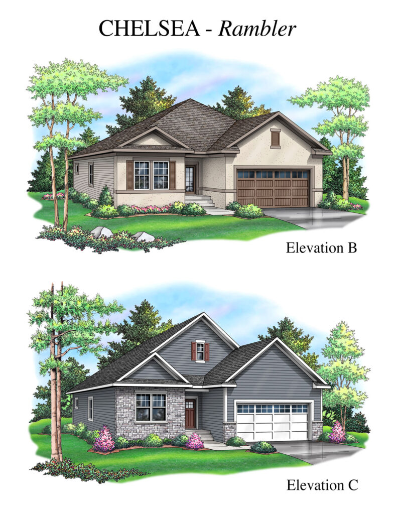 The Chelsea boasts such standard features as 9-foot ceilings and wall to wall windows on the back side of the home. You also get a flooring and lighting allowance, granite countertops in the kitchen and bathroom, handicap accessible main level, 96% energy efficient furnace, and central air conditioning, Aprilaire humidifier, Wi-Fi home controls, a video doorbell, and Wi-Fi door locks and garage door opener. Each home has a lawn sprinkler system and landscaping.