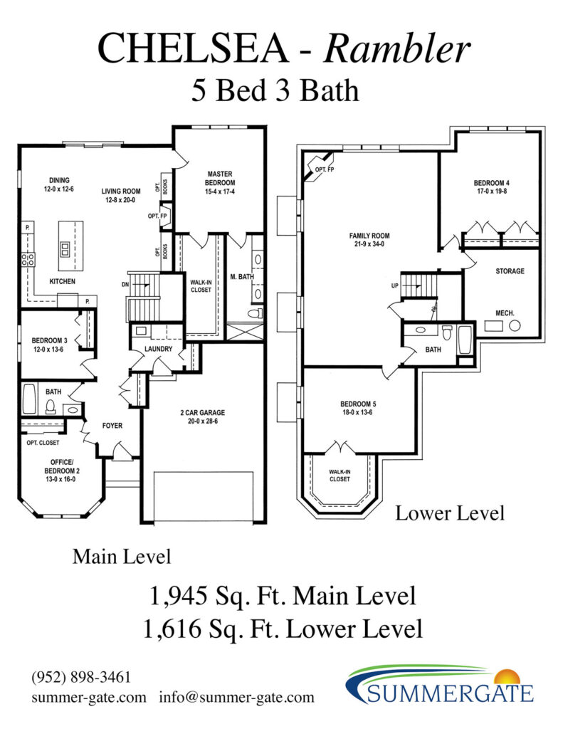 The Chelsea gives you many options for layouts. This exceptional 3-5 bedroom, 2-3 bath home has two walk-in closets, a kitchen island, and a 23’×33.7′ family room, as well as an optional deck. The Chelsea has 1,828 sq. ft. on the main level and 1,499 sq. ft. on the lower level. With 3 bedrooms on the main level, there is plenty of room for your family to grow.