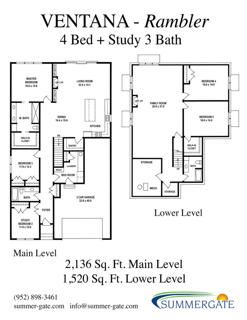 The Ventana gives you many options for layouts. This exceptional 5-bedrooms and 3-bath home has two walk-in closets, a kitchen island, and a 20’×37′ family room, as well as an optional built-in. The Ventana has 2,136 sq. ft. on the main level and 1,520 sq. ft. on the lower level. With 3 bedrooms on the main level, there is plenty of room for your family to grow.